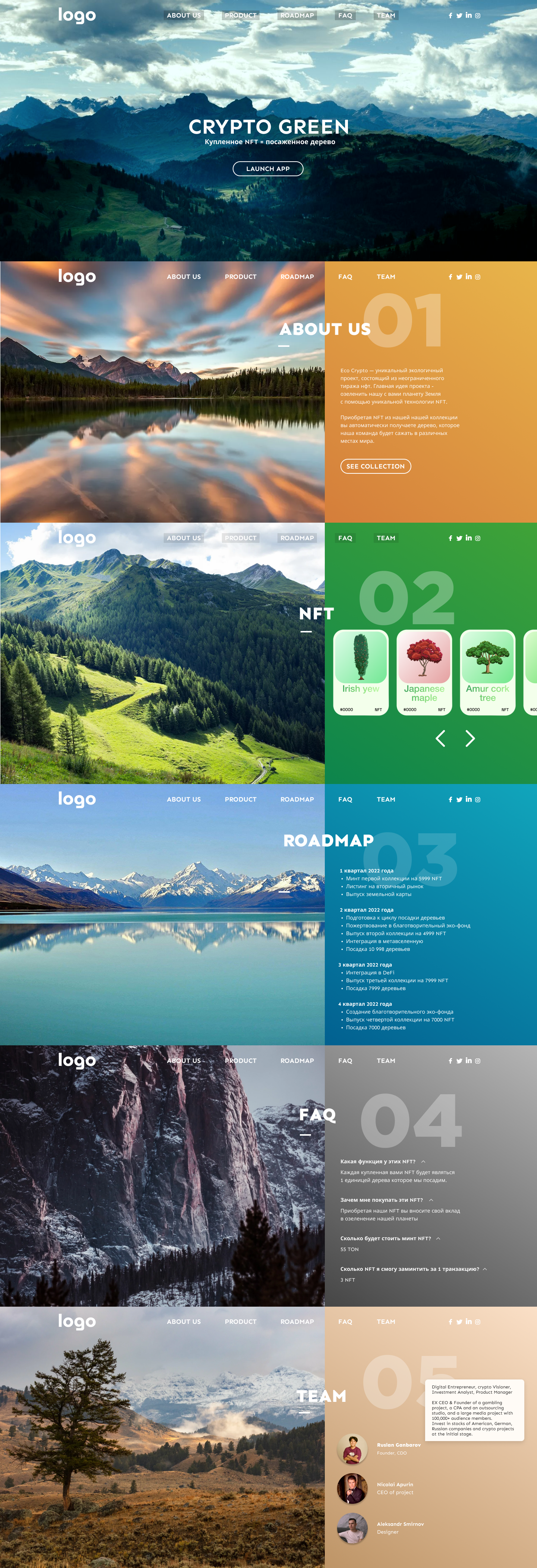 Задачей стояло не только донести идею заказчика до графического дизайнера, но и сформировать сайт, презентацию в одной стилистике, которая связана одновременно и с природой, и с blockchain